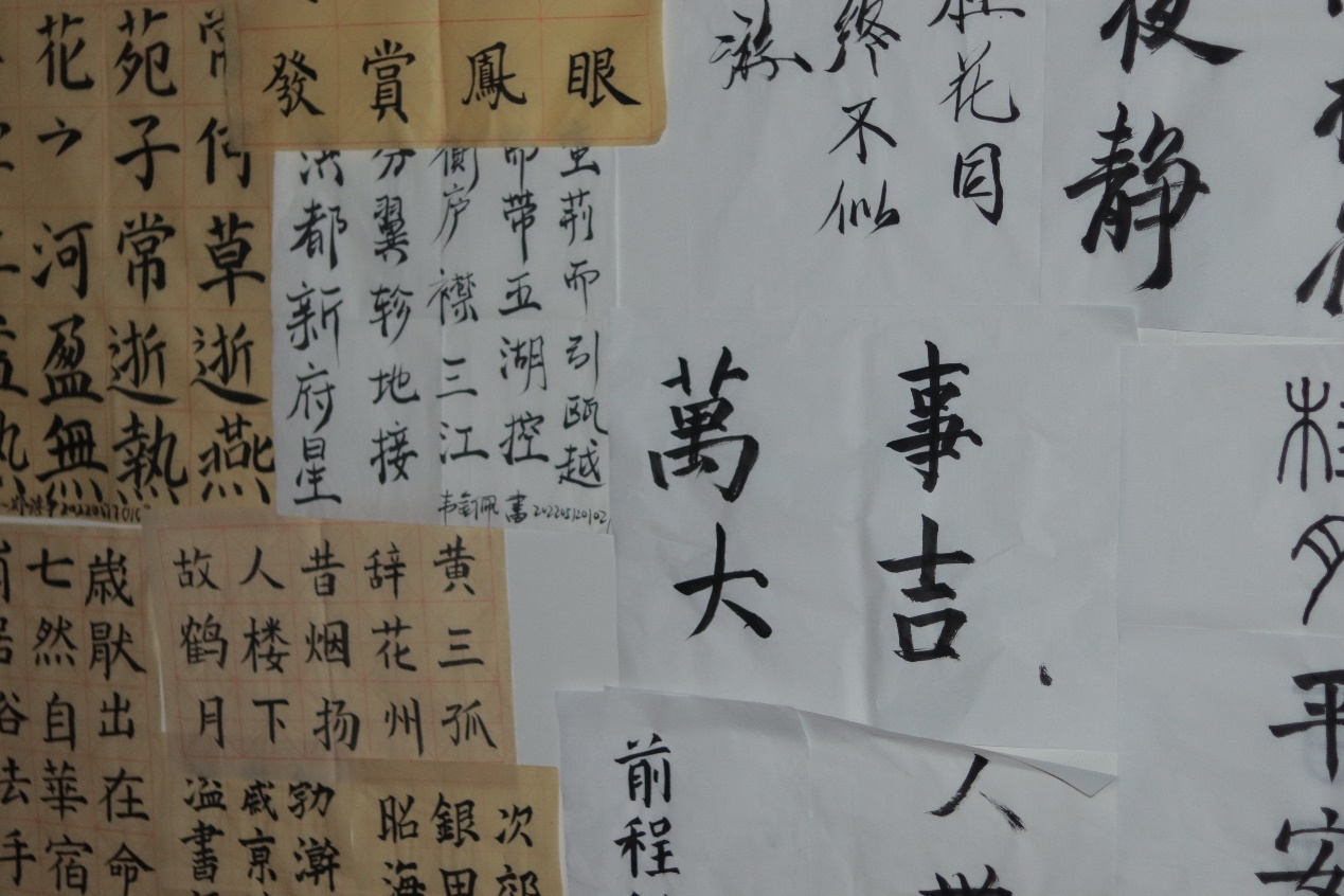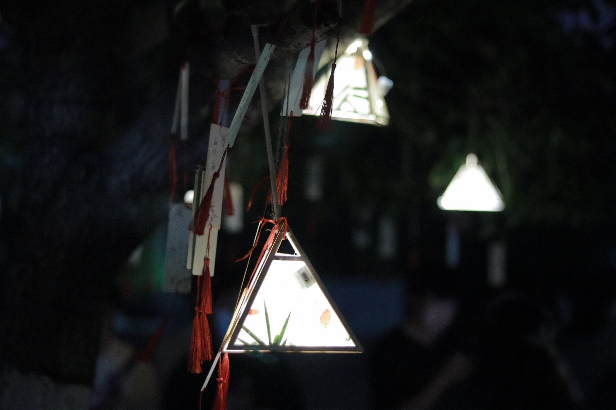此次灯会的开场可谓一绝,亮灯仪式别出心裁,引得在场观众阵阵惊呼。亮灯仪式过后,同学们可以进行签到,领取自己的集章表并盖签到章,领取到集章表后可参与各类活动获得对应奖励。首先映入眼帘的就是趣味灯谜项目。精巧的花灯挂在树枝上树影斑驳、明暗交错,是一场视觉的盛宴,同学们一拥而上纷纷投入了猜灯谜环节。零星几字,蕴含着中国汉字的无穷魅力,同学们抬头赏灯之时,仿佛在与古人进行时空对话。再往前踏上几步,墨汁散发的独特清香就会引得同学们驻足与书法知识展板块。参与的同学凭两片花瓣兑换一张宣纸并进行现场书法创造,最终凭书法作品获得3-5片不等花瓣与盖章。