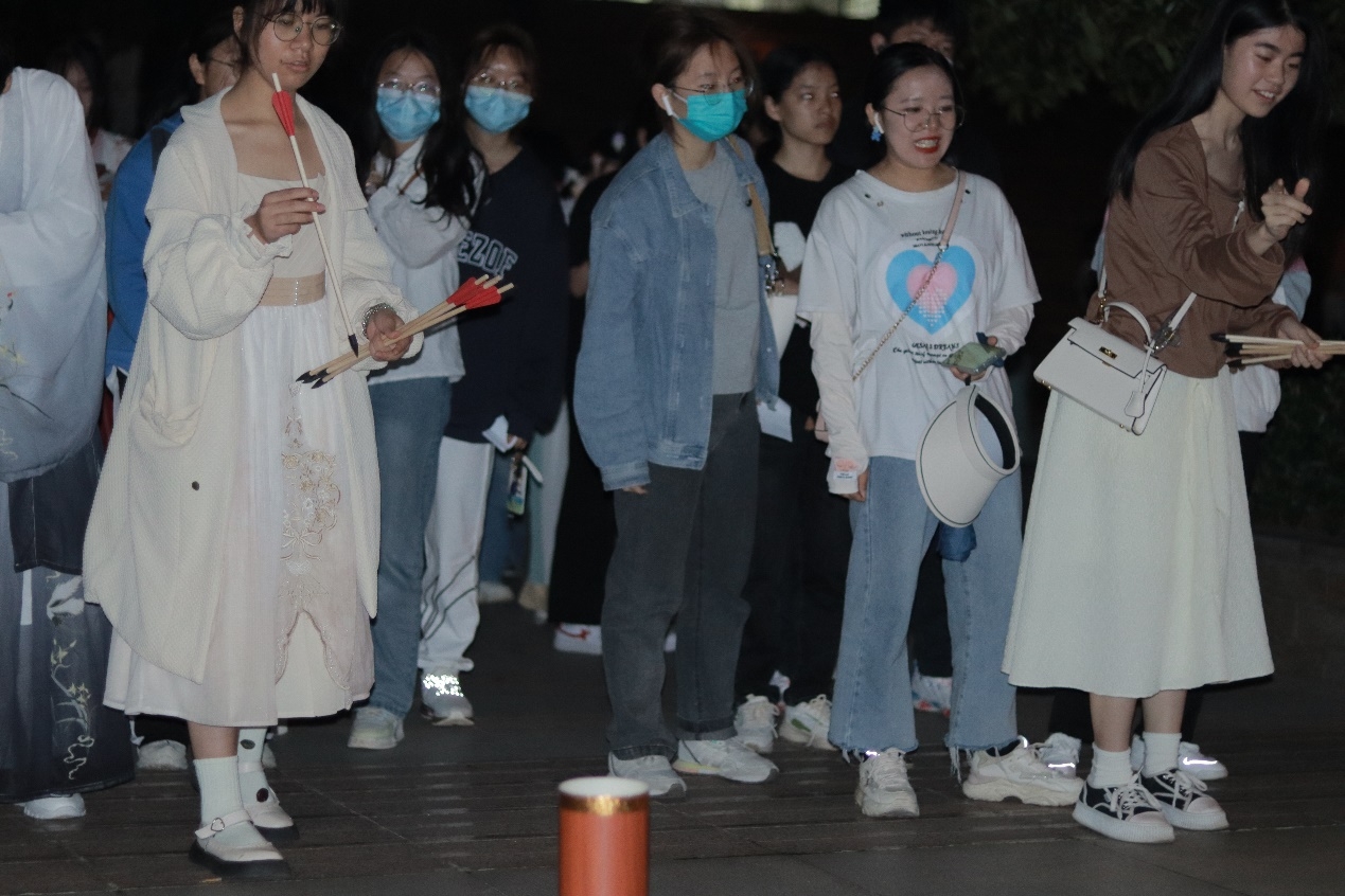 不远处是糖绘项目,舀糖浇铸之间更能明白手艺人的功夫之深,这门手艺需要更多年轻人来传承发扬;慢慢踱步至花灯祈愿项目,虔心祈愿的场景在这个稍显热闹的晚上显得格外温馨;当然,最受瞩目的项目莫过于投壶,每名同学需要在3-5分钟内按投壶的命中数量奖励花瓣;活动现场还有身着汉服的志愿者们,向大家展示着汉服的绚丽华美,同学们可以身着汉服进行打卡,亦可以获得花瓣奖励。两个小时的庙会在欢声笑语中进入尾声,活动最终获得的奖励可到兑奖处进行兑换奖品。
