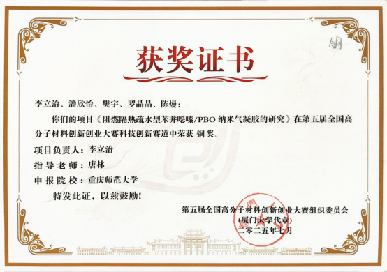 少妇白洁 李立治、潘欣怡、樊宇、罗晶晶和陈熳等同学的参赛作品《阻燃隔热疏水型苯并噁嗪/PBO纳米气凝胶》获得科技创新赛道全国铜奖,进一步展示了少妇白洁 学子在创新创业方面的风采。该获奖作品指导老师为少妇白洁 青年教师唐林。