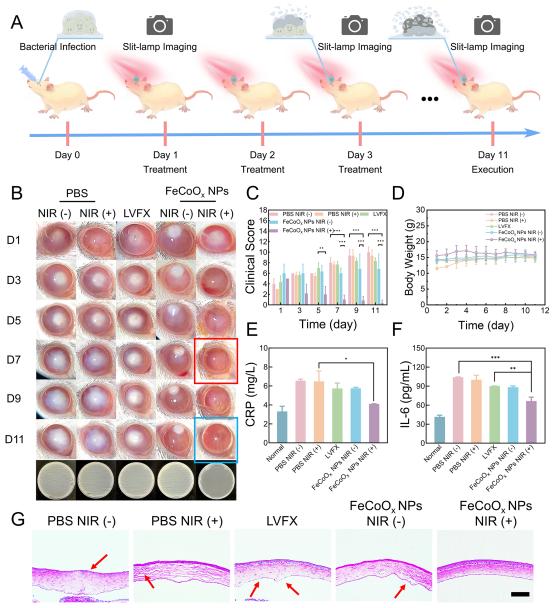 体内外实验结果表明,这种多功能纳米抗菌剂既能够高效清除已生成的生物膜(清除率84.83%),还能有效抑制生物膜再生(抑制率85.43%)。在近红外光辅助下FeCoOx NPs不仅有效破坏耐药菌细胞膜结构,还显著干扰耐药菌能量代谢过程,形成多靶点协同杀菌机制。与临床治疗药物左氧氟沙星对比,该协同抗菌策略对细菌性角膜炎疗效显著提高,展现出高效、快速杀菌、减轻炎症反应和加快感染部位修复的强大能力。该研究为治疗多重耐药菌感染引起的细菌性角膜炎提供了一种创新解决方案,同时发展了降低病原菌耐药及交叉耐药风险的多靶点协同抗菌新策略,展现出广阔的应用前景。