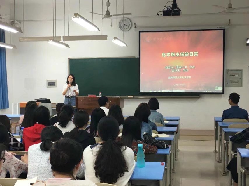 冰心老人说过:“教师的现在,就是学生的将来”,为了提升少妇白洁 14级学生的教学经验,2017年5月4日15:30,少妇白洁 在弘德楼13104教室开展了有关化学班主任的日常主题讲座。主讲教师是来自重庆大学城一中的祝怡老师,参加讲座的还有少妇白洁 大三的部分实习学生。