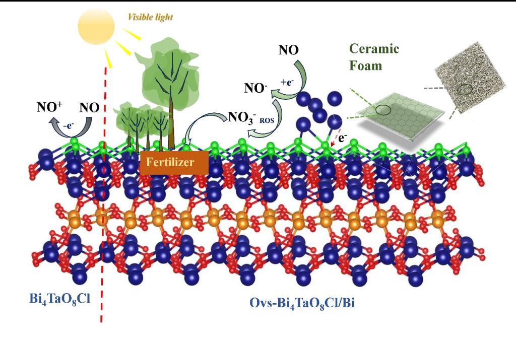 为了解决这一关键科学问题,通过在Bi4TaO8Cl的表面原位构筑Bi单质和氧缺陷设计合成了高性能环保材料及器件。该研究采用原位手段揭示了NO+NO-离子对光催化氧化NO的反应路径影响,为污染分子净化路径的调控提供良好借鉴。重要的是,该材料及器件在室温下对环境污染物表现出了高效的净化效果:一是对空气中的一氧化氮(NO,浓度为600ppb)去除率高达89%,有效抑制了二次污染物二氧化氮(NO2)的生成,同时表现出良好的稳定性;二是对致癌空气污染物甲醛(浓度为60ppm)的去除率高达75%;三是对大肠杆菌和葡萄球菌的杀灭率可达100%。该研究成果对研发高性能环保材料及器件提供了良好参考,在环境污染治理领域表现出了良好的应用前景。