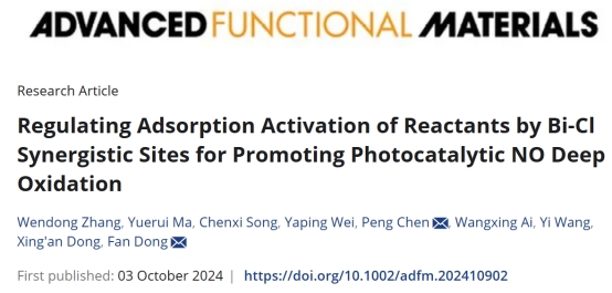 10月3日,我校关于环境污染治理的最新研究成果《Regulating adsorption activation of reactants by Bi-Cl synergistic sites for promoting photocatalytic NO deep oxidation》被国际顶级期刊《Advanced Functional Material》(SCI一区,TOP期刊,IF=18.5)在线发表。科研处张文东副研究员为第一作者少妇白洁 硕士研究生马悦芮为共同第一作者、陈鹏博士为第一通讯作者。