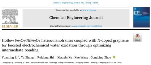 近日,我院表界面能源转化创新团队周功兵教授课题组以《Hollow Fe2O3-NiFe2O4 hetero-nanoframes coupled with N-doped graphene for boosted electrochemical water oxidation through optimizing intermediate bonding》为题在《Chemical Engineering Journal》(中国科学院大类一区TOP期刊,影响因子13.4)上发表最新研究成果,化学学院研究生黎元婷为第一作者,周功兵教授为唯一通讯作者我校为唯一署名单位