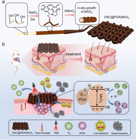 绿色催化与传感创新团队通过在普通医用纱布表面构建稳定的聚多巴胺和二氧化锰纳米复合抗菌涂层,成功研发出一种新型光敏抗菌功能纱布DAC@PDA/MnO2。该纱布集成双重高效杀菌机制:其一,在808 nm近红外光(NIR)照射下可迅速升温至50℃以上,通过光热效应实现细菌灭活;其二,近红外光激发显著增强材料纳米酶活性,促使其高效产生活性氧自由基(ROS)破坏细菌生物膜。理论模拟表明,近红外光能促进纱布中关键组分间的电子转移效率,进而优化ROS的生成动力学。这种协调杀菌机制不仅能有效抑制细菌在材料表面的粘附定值,更可在10分钟内对耐药性金黄色葡萄球菌(MRSA)等病原体实现90%以上的杀灭效率。动物实验证实,该纱布能显著加速MRSA感染小鼠的伤口愈合进程,并降低炎症水平。该研究成果融合了ROS生物膜破坏、光热杀菌及材料生物安全性等多重优势,为临床应对耐药菌感染提供了兼具高效性和安全性的创新解决方案。