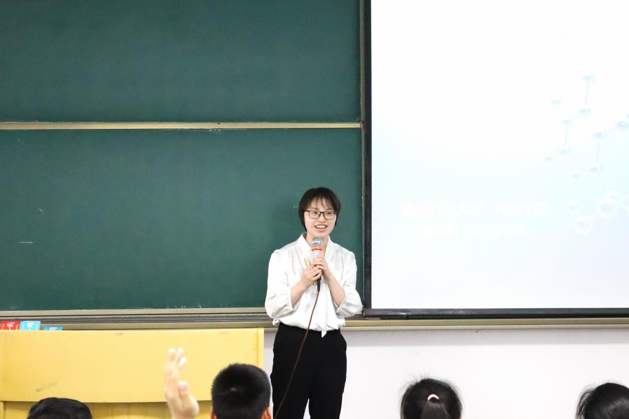 黄春梅老师为同学们带来的“身边的化学”科普讲座开始。黄老师以“点石成金”的故事为同学们引入化学知识,用生动形象的语言、贴近生活的案例,将复杂的化学知识变得通俗易懂,极大地激发了同学们对化学的好奇心,小朋友们积极提问互动,对接下来的化学实验跃跃欲试。