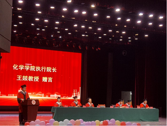 殷殷嘱托道出离别的不舍与未来期望。执行院长王燚首先对毕业生表示衷心祝贺,并送出三句话:第一,牢记“国之大者”,勇担时代使命;第二,“永远保持对知识的渴望和追求,勇于创新,躬身实践,把学习当作一种生活方式,一种不断进步的动力;第三,始终坚守自的信念和原则,做一个有道德、有责任感、有担当的人。希望同学们牢记“化知格物,学理修德”的院训,找到自己的化学方程式,在生命的反映中绽放最耀眼的光芒!