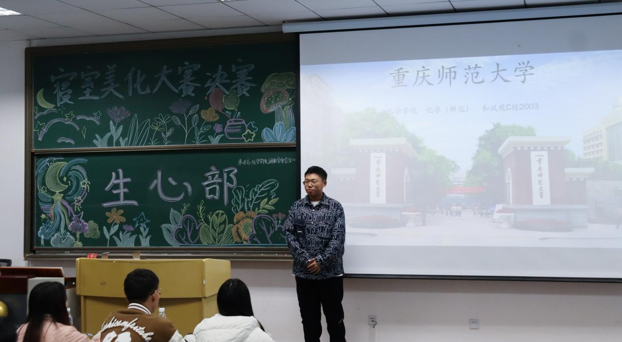 决赛现场,各宿舍代表通过精美的PPT介绍本宿舍的美化主题及其风格理念,创意新奇、演讲生动。各寝室都富含独特的化学元素:或是以实验服作为主体营造干净整洁的环境氛围,或是利用各种化学知识小标签为寝室装点化学有趣的色彩。还有部分寝室展示了他们的娱乐活动和生活习惯,他们用环保材料DIY艺术品以贴近绿色主题,如手工花瓶、墙贴等,让评委和观众们大开眼界。不仅如此,他们还晒出寝室成员的学习生活和成长目标的图片以互相激励提高成绩,寝室成员的照片展现他们的独特个性,不同的书桌装饰也反映寝室多样的文化特色,一张张合照都体现着寝室内部的团结友善。