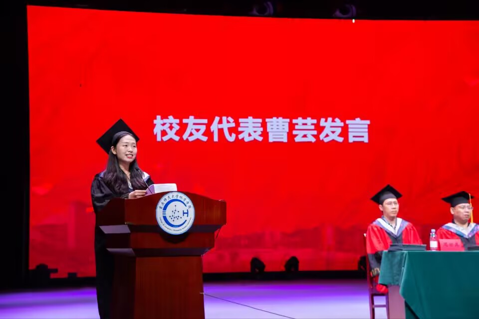 随即,师范生代表王倩发言,她从高考谈到现在,表达了对母校的感情。四年里,她“朝去教学楼,午住图书馆。夜归宿舍楼”,获得一等奖学金和省级、国家级师范生技能大赛奖项,目前也成功入职重庆市璧山中学校。非师范生代表李茹欣提到了她在学生工作岗位上挥洒激情,锻炼自我,在各种社团活动和专业竞赛中提升综合素质。在实验室和实习基地里提升专业技能,拓展自身事业。这些一件件经历的事,一本本看过的书变成了一条长长的路,送她走向明媚的远方,她成功保研到南开大学。研究生毕业生代表吴世阅强调人生是一场永无止境的修行,我们还要守护好自己的心田,在立业之后为天地立心,为生民立命。处理好理想与现实之间的关系,心怀仁爱。