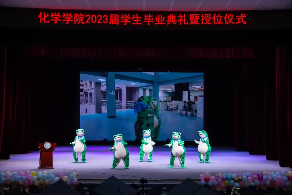 典礼开始,网红小青蛙在动感的音乐中为在场观众带来了一段可爱的青蛙舞,舞蹈团向我们展示了青春活力的舞蹈表演,合唱团为我们带来了动听的歌曲。舞姿飒爽,歌声悠扬,现场气氛被逐渐推向高潮。