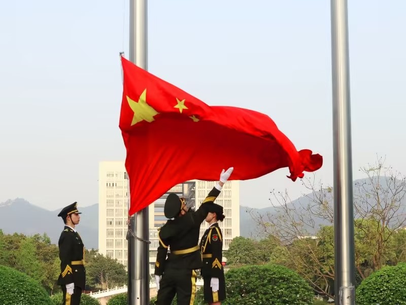 清晨七点四十,升国旗仪式正式开始。英姿飒爽的国旗护卫队迈着整齐划一、铿锵有力的步伐,迎着朝阳,以饱满的热情护送着五星红旗正步走向旗杆。激昂的《义勇军进行曲》奏响,全体师生肃立致礼,深怀对祖国的无限热爱和崇高敬意,五星红旗伴随着振奋人心的歌声冉冉升起,迎风舒展。