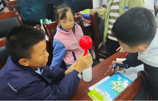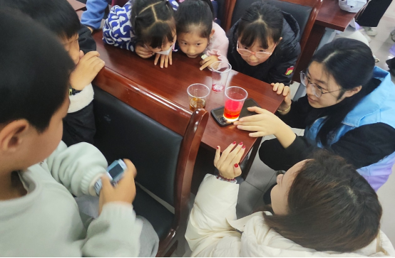 志愿者们还结合自身专业特色,设计了趣味化学小实验。首先是紫甘蓝变色实验——紫甘蓝汁液在不同酸碱度下的颜色变化。在志愿者的精心操作之下,杯子里的溶液很快呈现出绚丽的色彩,这调动了孩子们的好奇心,激发了他们探索的欲望,个个热情高涨、兴致勃勃。接下来,小朋友们分组亲手操作进行火山熔岩灯和柠檬酸与小苏打吹气球实验。在志愿者的照看和帮助下,气球随着瓶子的震荡很快鼓了起来。而那火山熔岩灯也发出通红的颜色,杯子里不断翻涌着气泡,好像真的火山喷发。实验结束后,小朋友们仍意犹未尽,沉浸在做实验与观察现象中无法自拔。