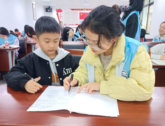 小朋友们陆陆续续到达社区准备的教室,未来教师协会的吕兰同学为每个小朋友分配一名志愿者,对孩子们进行一对一辅导。志愿者自我介绍后开始了解孩子们的基本状况,原本沉默的气氛也变得活跃起来。在辅导期间,同学们先是认真地给孩子们讲解书中的知识,仔细地解答孩子们在学习中遇到的困难,帮助孩子彻底理解知识。更加细心的是,志愿者们还讲了一些学习方法和学习技巧,帮助他们快速掌握学习的要领。