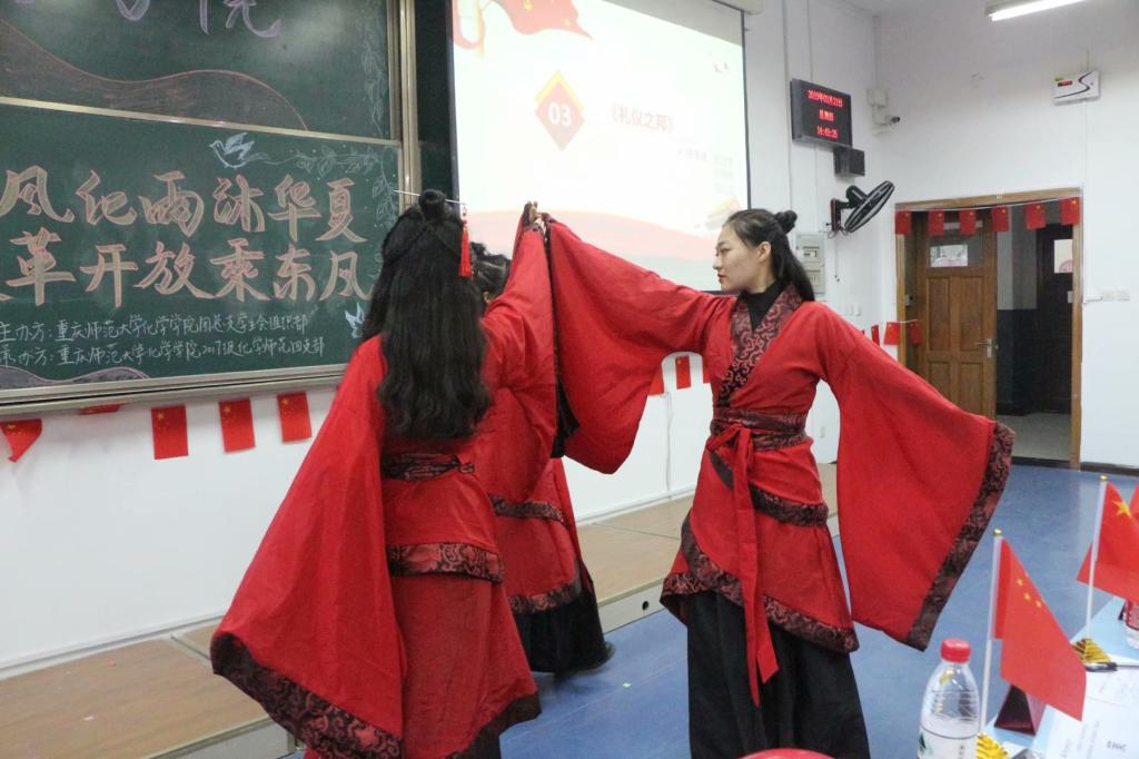 配音节目之后,同学们共同观看了一段支部自制的视频《四十年辉煌发展》。一首《走进新时代》,一幅幅发展变迁的画面,一个个强国筑梦的故事,深深打动着在场观众的心。看完视频,由张钰雯、陈昕瑞、陶怡丞三位同学带来的舞蹈《礼仪之邦》使同学们在惊叹之余感受到了华夏数千年的文化底蕴。衣袖翩翩,裙袂飘飘,中华之神采自此而绽放!