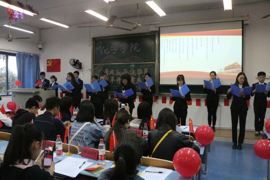 李昭瑩等十位同学带来的诗朗诵《不忘初心》,用一句句铿锵的话语,表达出了新一代大学生跟党走的坚定信念和昂扬向上的拼搏斗志。聆听完气势如虹的朗诵,全班同学在闻洪林的带领下共同唱起了《我爱你中国》。现场歌声嘹亮,国旗挥舞,大家的爱国之情好似被瞬间激发,这是一个拥有强大凝聚力的班集体对祖国最深沉的告白,是17级化师四支部全体同学对坚定信念的极佳诠释。这歌声,使每一位同学心潮澎湃,也把整个活动引入了高潮!