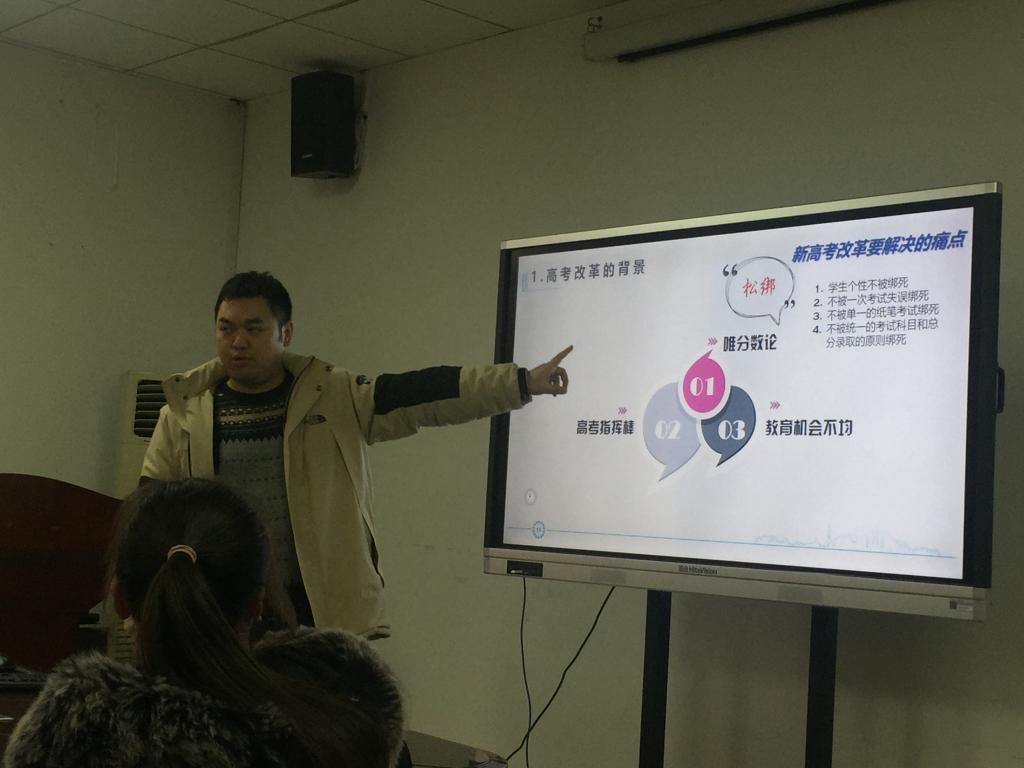 师者,所以传道授业解惑也。田力老师首先对韩愈的这句话谈出了他的看法,作为老师,不只是简单的教书匠,而且要教授学生为人处事的道理与主动学习、勇于质疑等可贵的品质。接着他从1977年恢复高考开始介绍了我国高考的发展历程以及此次高考改革的背景及意义。