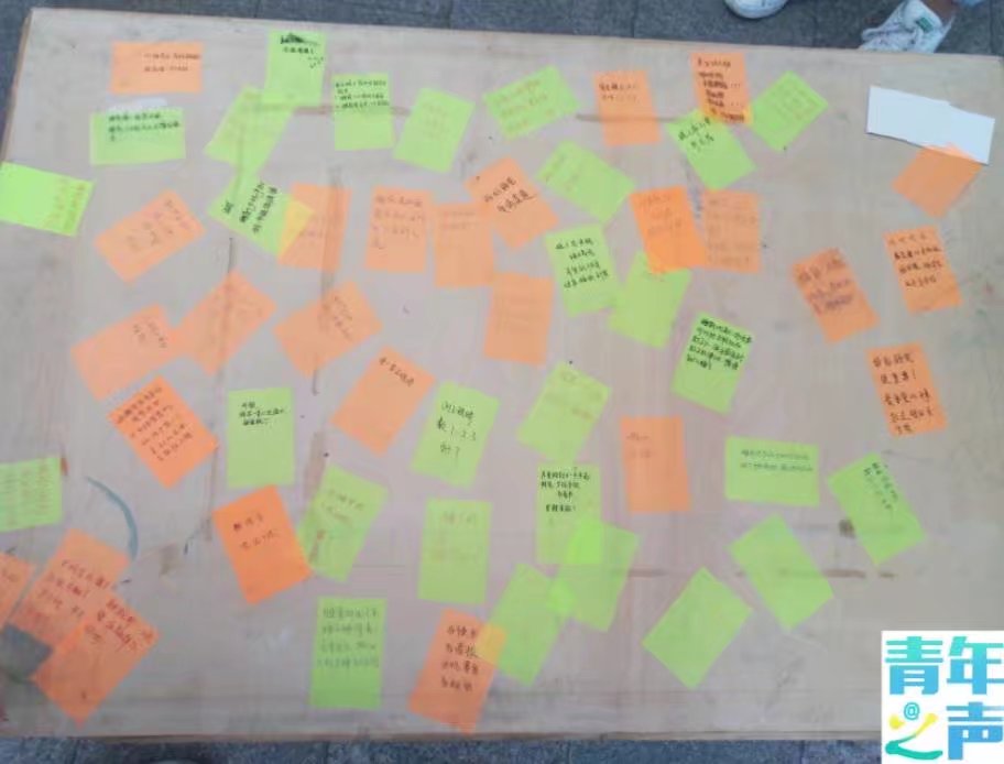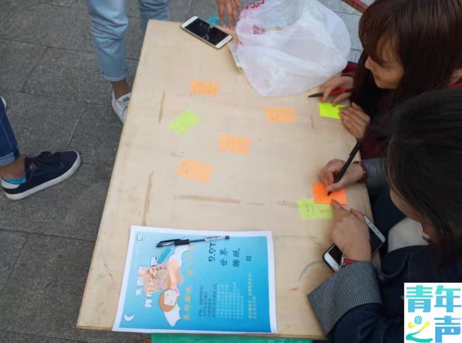 傍晚时刻,正值饭点,来到校三食堂大门前,你会发现有这样一批人,有的拉着“美好睡眠,放飞梦想”的横幅,吸引着同学们;还有的志愿者拿着关于睡眠的宣传单,向进出食堂的同学们宣传好睡眠的重要性和一些改善睡眠的方法。此外,一些对活动感兴趣的同学还纷纷在便利贴上留下了自己在“提高睡眠质量”方面的做法、建议和对同学们的寄语。