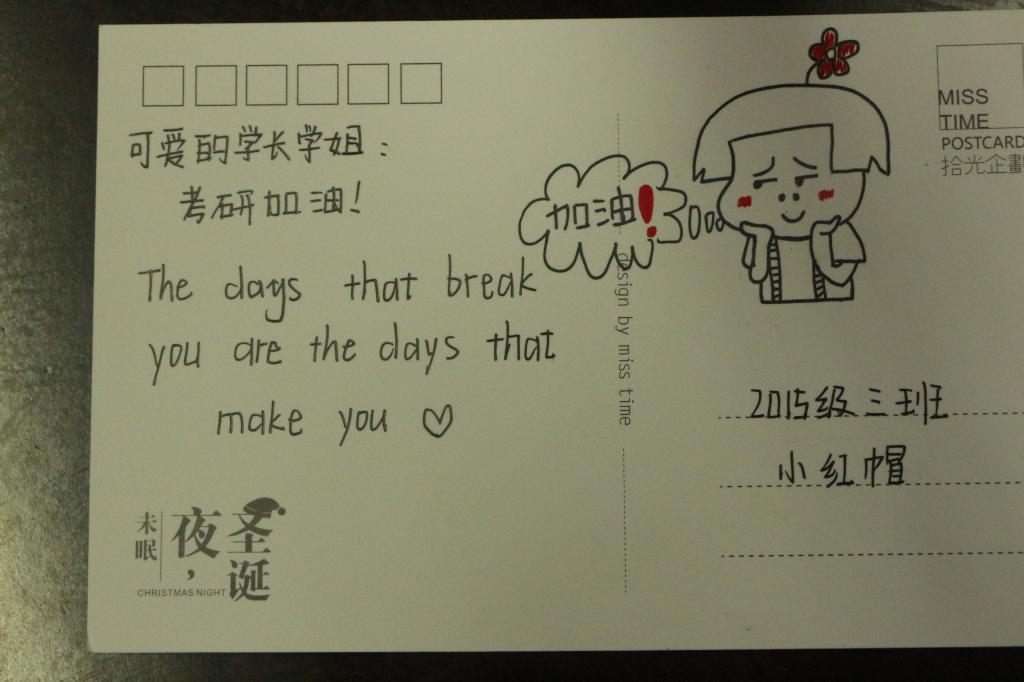 2018届毕业生,用积极的态度迎接研究生考试,用不松懈、不放弃的精神面对考研的挑战。同时,殷切的叮嘱学生,最后的备战时间,要注意身体,调整状态,保持一颗平常心,走上考场都是成功。