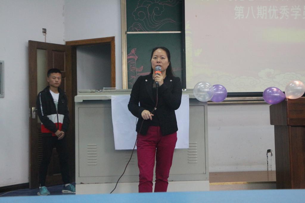 紧接着,卢洪英书记发表讲话。她提到了当代学生要牢记时代责任感,珍惜大学生活,奋发图强,做有为青年。台下的同学们听得十分专注,还不时做着笔记。接下来,于斌和卢洪英老师给第八期学员颁发结业证书。
