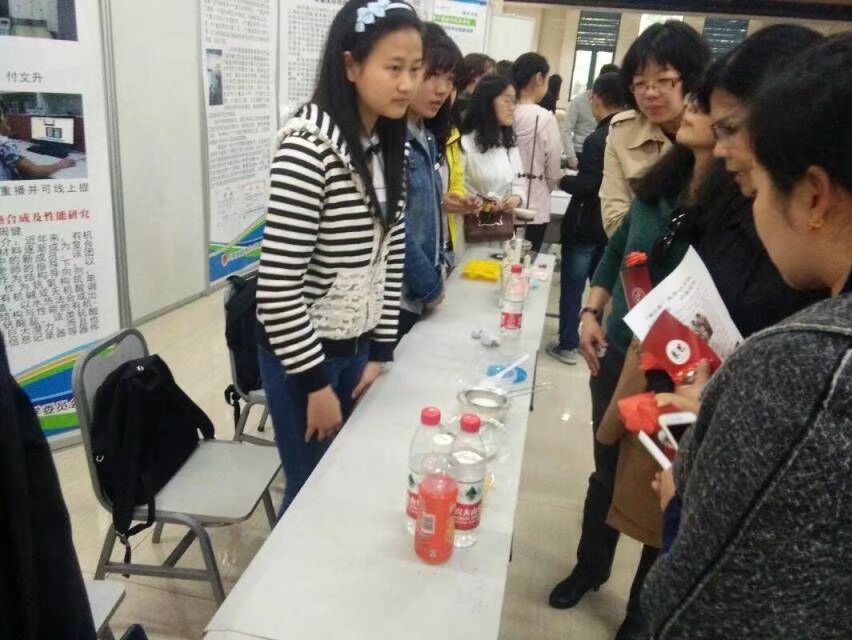 同学们都带着渴望的眼神来了解各种东西的制作方法,讲解的同学也很积极的为大家讲解。其中对于制作分子美食的印象比较深刻,因为现场制作出的分子美食就像一颗颗的鱼子一样,而且还可以食用,开始的时候,同学们带着怀疑的眼光认为这不能吃。其实他是利用海藻酸盐和钙离子发生胶凝反应的这一特性,分子美食家们创造出了众多有创意的美食,所以是可以食用的,当同学们品尝一点之后,都纷纷表示不错。紧接着,有学校的领导也到现场来观看,讲解的同学也为来观看的领导讲解其展品的相关原理。