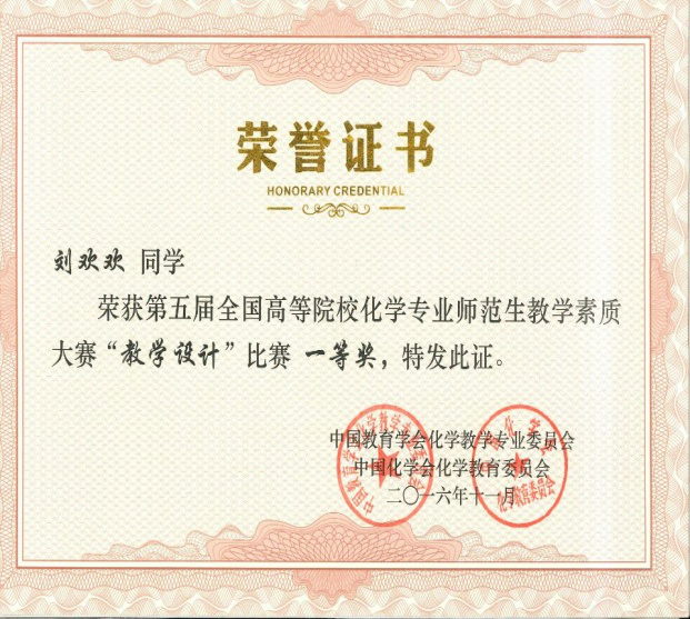 学子获第五届全国高等院校化学专业师范生教学素质大赛决赛一等奖