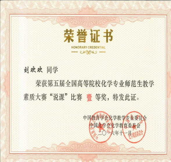 2013级化学专业刘欢欢同学荣获现场“说课”决赛一等奖。