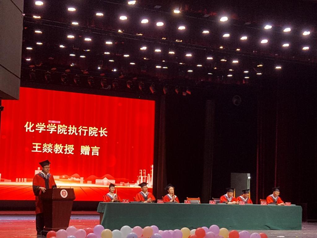 殷殷嘱托道出离别的不舍与未来期望。执行院长王燚首先对毕业生表示衷心祝贺,并送出三句话:第一,牢记“国之大者”,勇担时代使命;第二,“永远保持对知识的渴望和追求,勇于创新,躬身实践,把学习当作一种生活方式,一种不断进步的动力;第三,始终坚守自己的信念和原则,做一个有道德、有责任感、有担当的人。希望同学们牢记“化知格物,学理修德”的院训,找到自己的化学方程式,在生命的反映中绽放最耀眼的光芒!