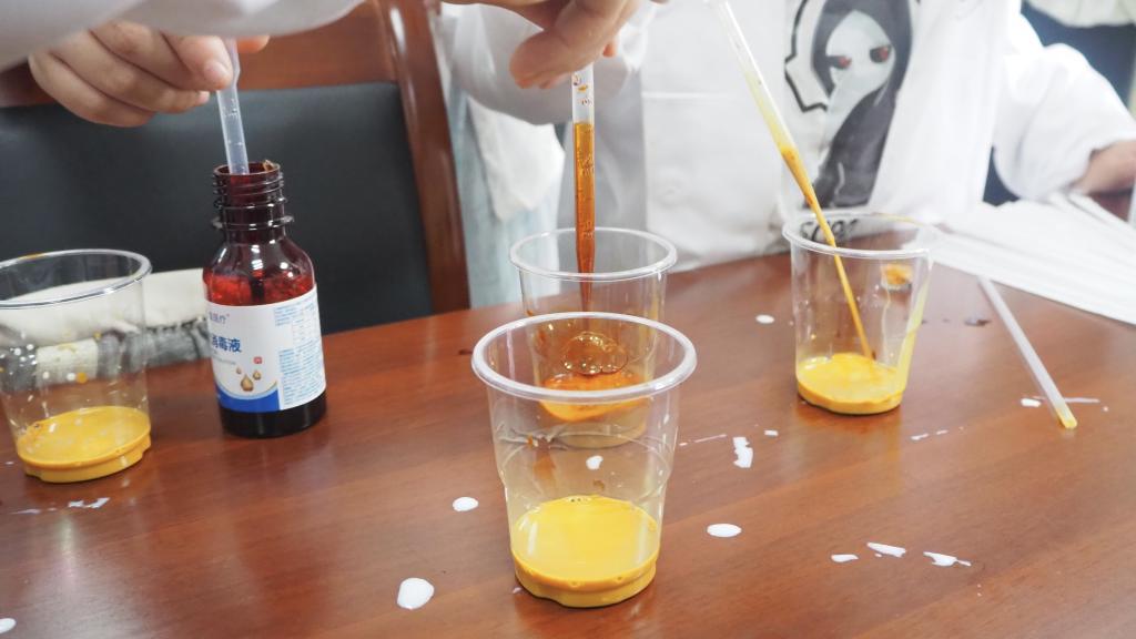 活动现场,科普协会的志愿者们化身“化学魔法师”,通过简单易懂、生动有趣的方式,向小朋友们展示了“大象牙膏”“彩虹牛奶”“火山喷发”等趣味化学实验。随着过氧化氢与催化剂接触,大量泡沫如喷泉般涌出,“大象牙膏”瞬间“长高”,引得孩子们发出阵阵惊叹;当色素在牛奶中与洗洁精相遇,绚丽的色彩如烟花般绽放,小朋友们目不转睛,脸上写满了好奇与兴奋;模拟“火山喷发”的实验中,小苏打与柠檬酸反应产生大量气泡,仿佛真的火山在“喷发”,小朋友们纷纷凑上前,想要一探究竟。