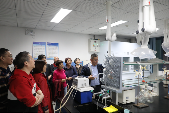 图6:刘玺副院长(主持工作)带领77级校友参观化学实验室