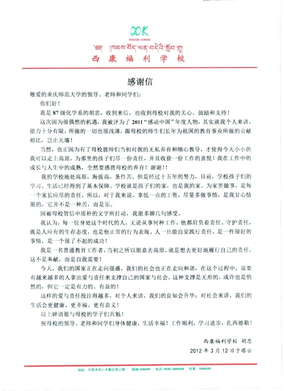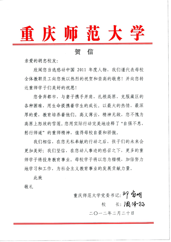 87级校友胡忠被评为2011年度“感动中国十大人物”。学校领导邓卓明书记、周泽扬校长随即向胡忠校友发去贺信,代表学校全体教职员工向胡忠校友致以热烈的祝贺和崇高和敬意,并转达重师学子们的美好祝愿。近日,胡忠校友致信母校,感谢母校养育与教导之恩。