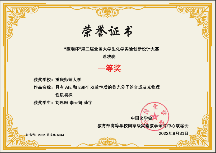 2020级学生刘思阳、李云妍和孙宇的参赛作品《具有AIE和ESIPT双重性质的荧光分子的合成及光物理性质初探》(指导老师:张岩副教授)在全国410所高校、908支参赛队伍中脱颖而出,在总决赛中荣获全国一等奖,实现了我校在该项赛事上的重大突破。