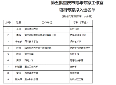 据悉,第五批重庆市青年专家工作室领衔专家共9人入选,重庆市人力资源和社会保障局将为入选专家授予专家工作室铭牌。