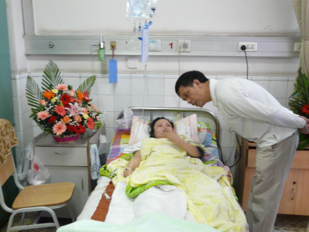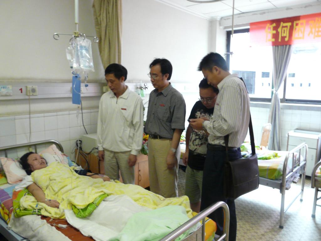 图为梁国明院长十分关心地询问张老师目前伤势及家庭情况