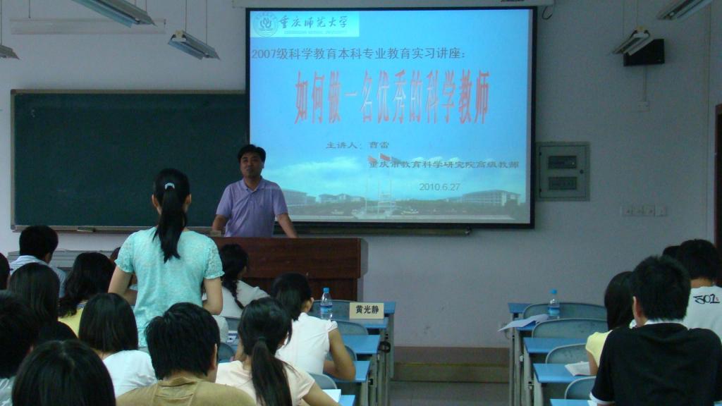 在13101教室特意举办了一场教育实习讲座。讲座邀请了重庆市教育科学研究院高级教师曹雷老师以及少妇白洁
