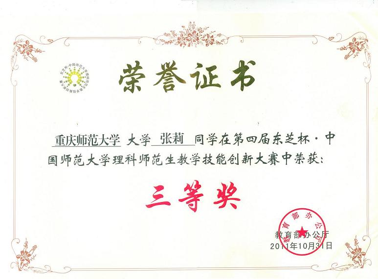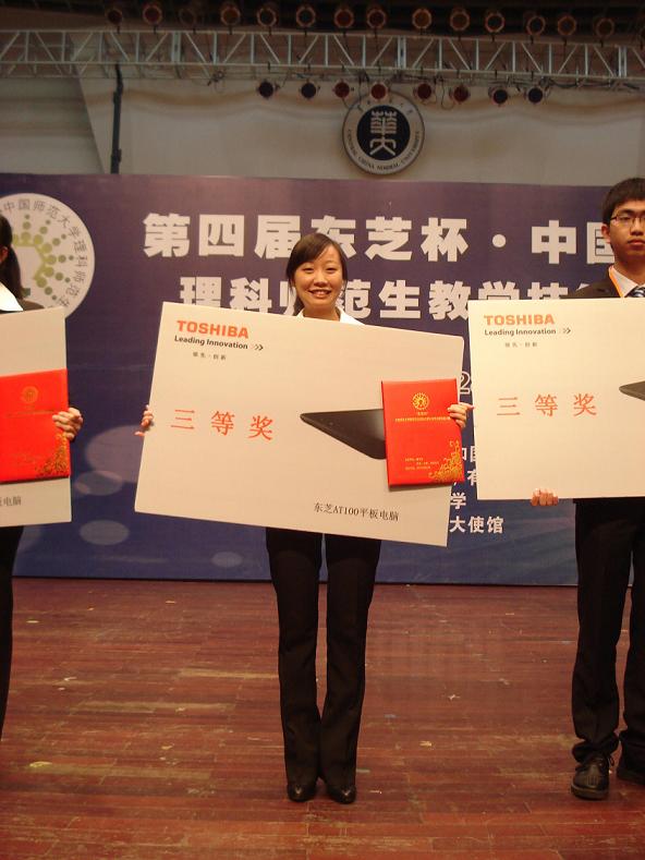 据悉,东芝杯•中国师范大学理科师范生教学技能创新大赛,由中华人民共和国教育部与东芝(中国)有限公司联合主办,旨在培养造就一批“师德高尚、理念先进、业务精湛、锐意创新”的优秀理科教师后备力量。全国所有师范大学(共40所)的数学、物理、化学三个学科各派一名选手参加全国比赛。比赛内容包括教案设计、即席演讲、模拟授课、现场提问等四个环节。大赛共评选出一等奖1名、二等奖3名、三等奖6名。