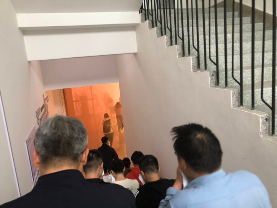 疏散过程中,师生低头弯腰,用湿抹布捂住口鼻,快步疾行,有序、安全地到达集合地点。