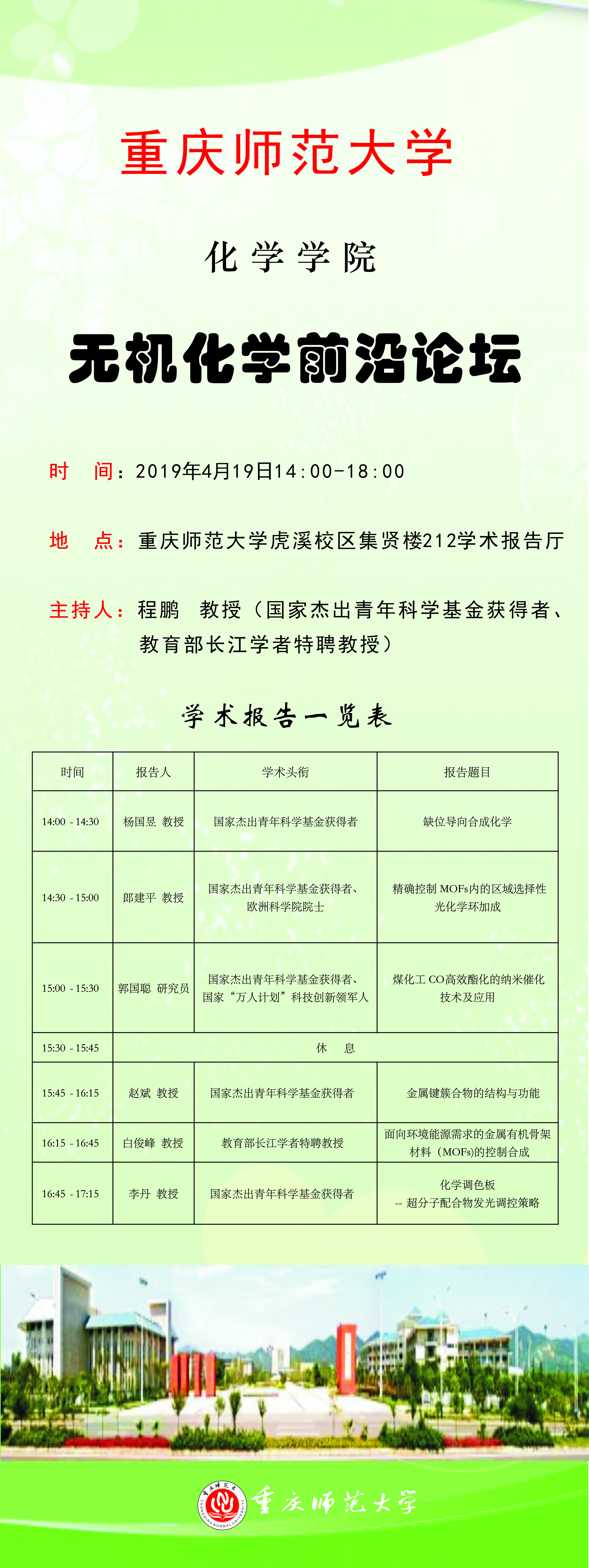 承办的无机化学前沿论坛将于2019年4月19日下午14:00至18:00在少妇白洁